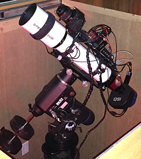 My primary imaging rig is housed in a mini roll-off-roof imaging obervatory of my own design and build - Inner Light Observatory. The primary OTA is a Stellarvue SV105 apochromatic refractor. The stock focuser has been replaced with a 2" Moonlite focuser with high resolution stepper motors for computerized focus control. This is saddled on an Orion Atlas EQ-G mount, modified with a Rowan belt kit (Rowan Astronomy). The mount sits on a custom built 8" diameter steel pier and is coupled using a top plate adapter from Dan's Pier Plates. The primary imaging camera is a QSI683 (Quantum Scientific Imaging) with integrated 8-position filter wheel and off-axis guide port (wsg-8 model). This is outfitted with a Starlight Express Lodestar X2 guide camera. All equipment is connected via USB to a StarTech 7-port DC USB hub and powered by a PowerWerx 30 amp DC switching power supply (imaging camera is powered separately on it's own adapter). I use Anderson powerpole couplings for all power connections which are run to a Rigrunner fused power bank (including dew heaters). The entire assemply is connected to an APC battery backup and surge protector. The rig is controlled by an on-board Quantum Access fanless PC stick with built-in wifi (Intel BayTrail T quad-core, 2GB DDR3L ram and 32GB storage - built in micro SD supplies additional 64GB storage) runing Windows 10.